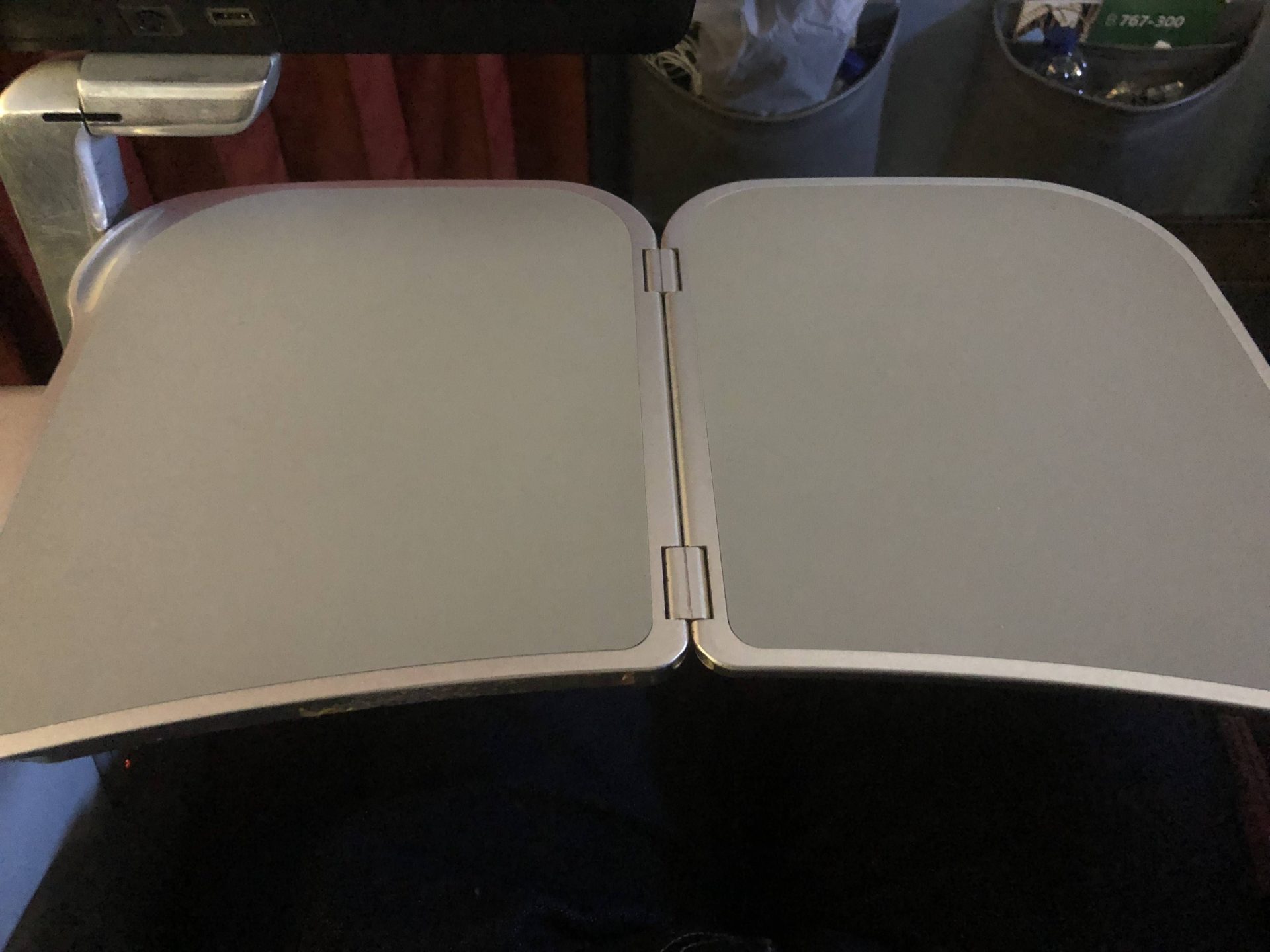 Detalhe que as mesinhas nesses assentos ficam armazenadas no apoio de braço, bastando levantar a proteção para ter acesso a elas.