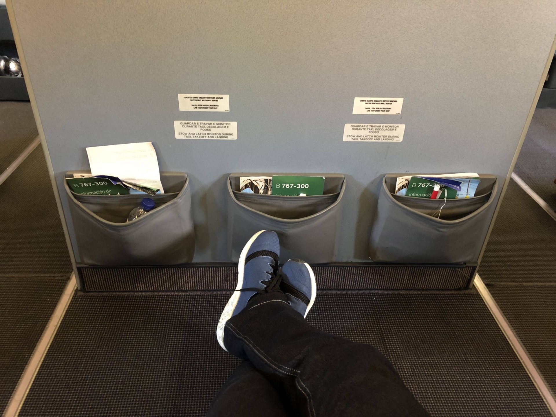 - Primeiro porque fiz o voo no assento com mais espaço para as pernas (aqueles da primeira fileira), então é uma visão diferente para quem quiser optar por comprar esse lugar.