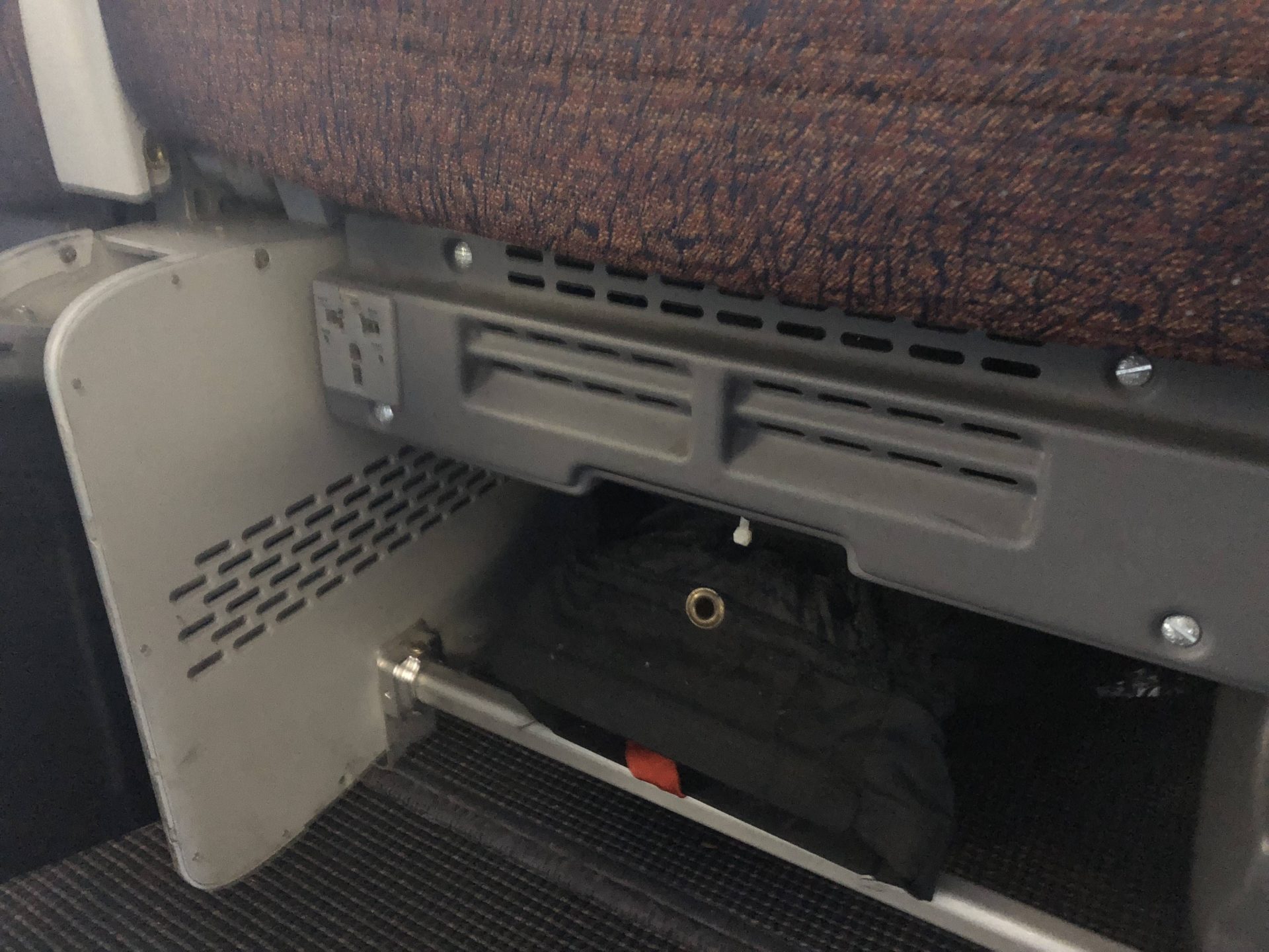 Diferente dos outros assentos da econômica, aqui as tomas universais ficam embaixo de onde você se senta, então, quem não presta atenção, acaba nem reparando.