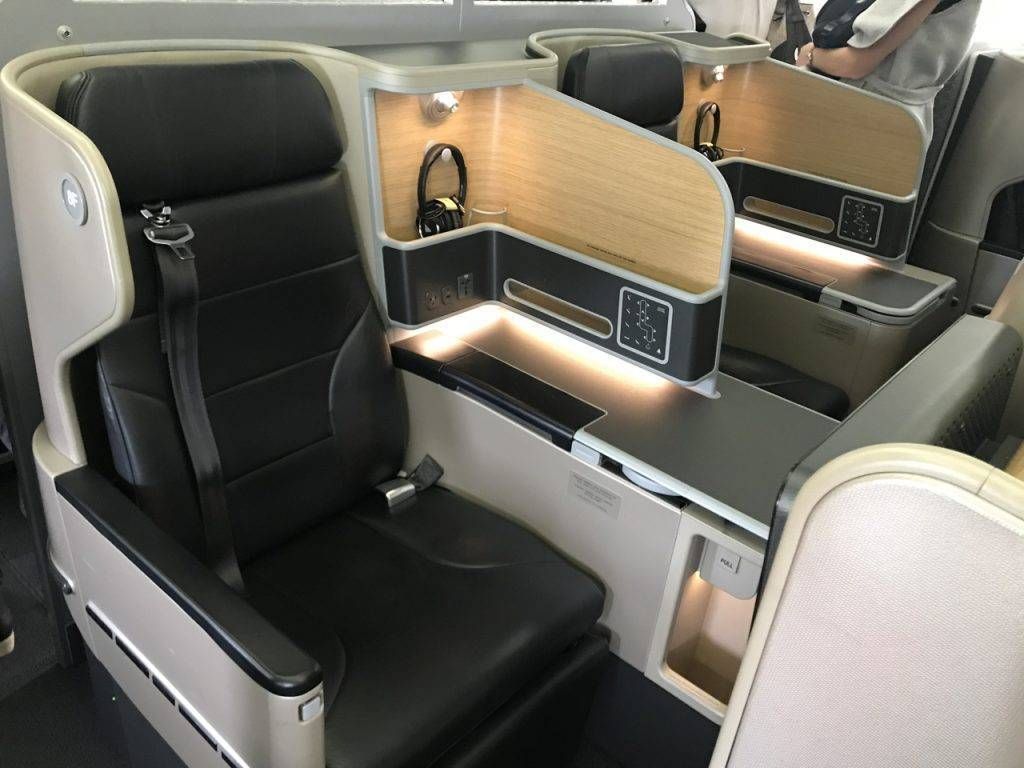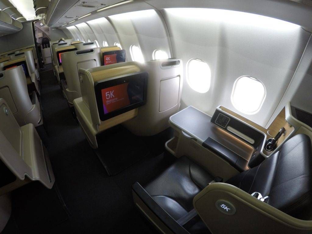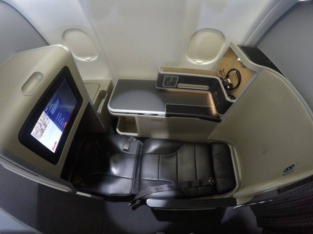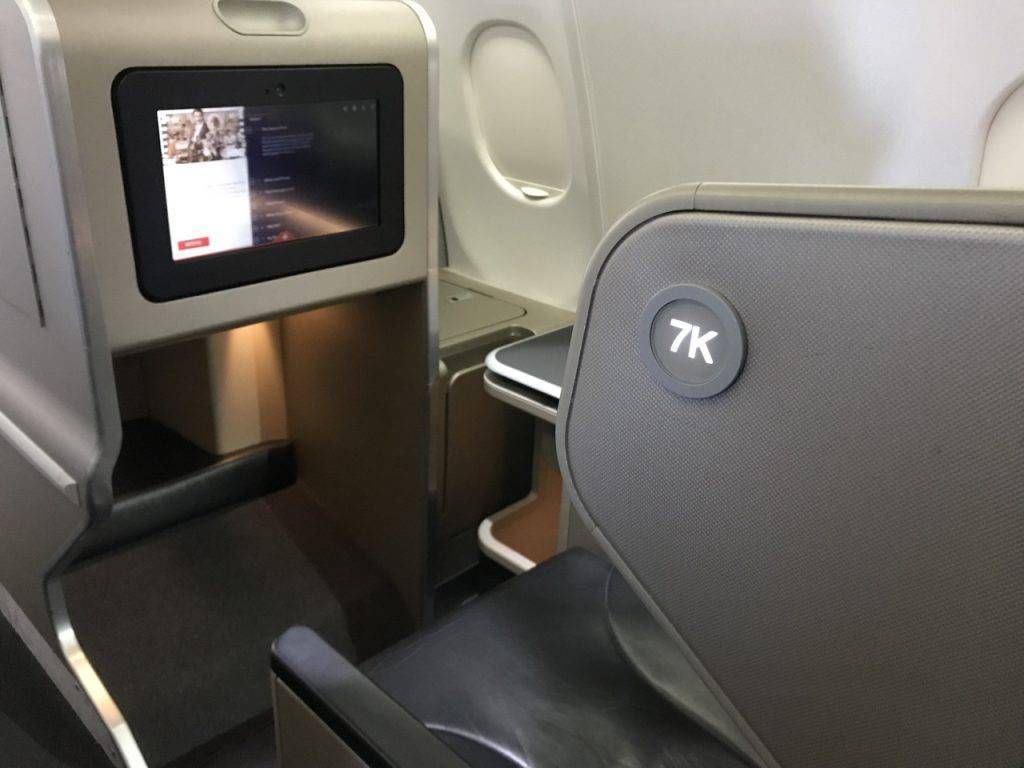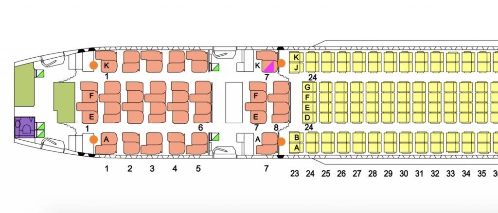 A business é divida em 2 seções como vocês podem ver no mapa de assentos abaixo. Optei por sentar no 7K, já que o assento é mega privado e fica na “mini-cabin”.