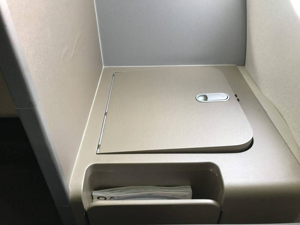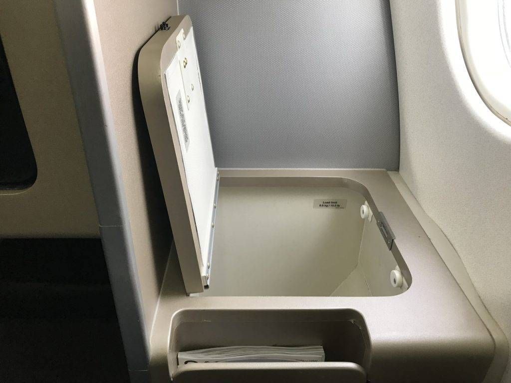 Pelo fato do meu assento estar no bulkhead, ele tinha um compartimento extra ao lado da TV.