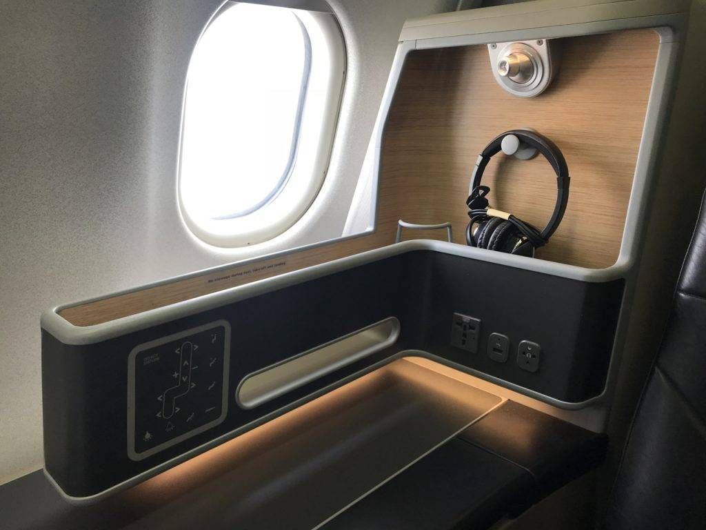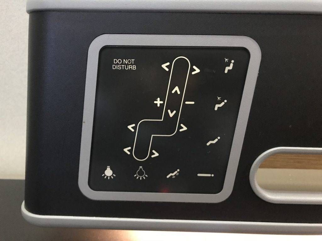 A cadeira conta com um console lateral, que no meu caso ficava ao lado da janela. Lá você tinha o controle de posição da poltronas tomada, portas USB, luz de leitura individual e o porta headphones.