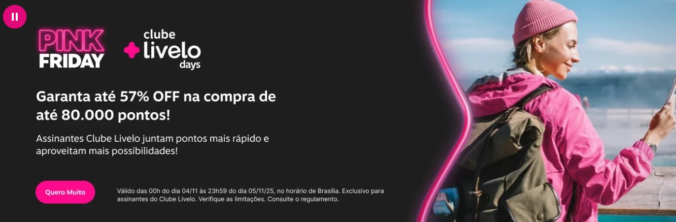 Clube Livelo Days no ar! A Livelo está oferecendo até 57% de desconto na compra de pontos para assinantes do Clube Livelo. Na campanha, é possível parcelar em até 12x sem juros as compras acima de R$ 360. A promoção é válida até amanhã (5).