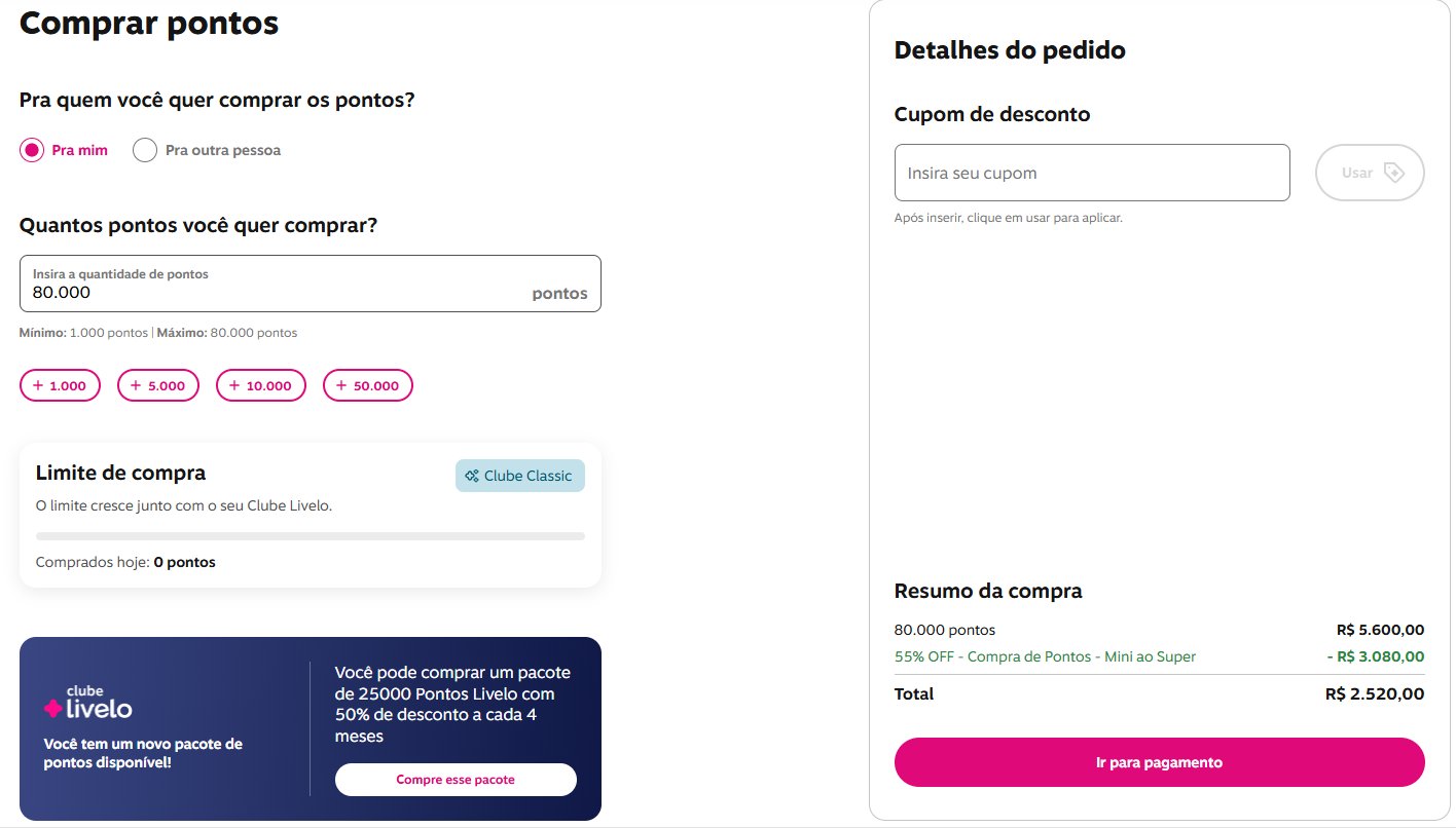 • O limite é de 80.000 pontos Livelo na categoria “Compra de Pontos para você”.