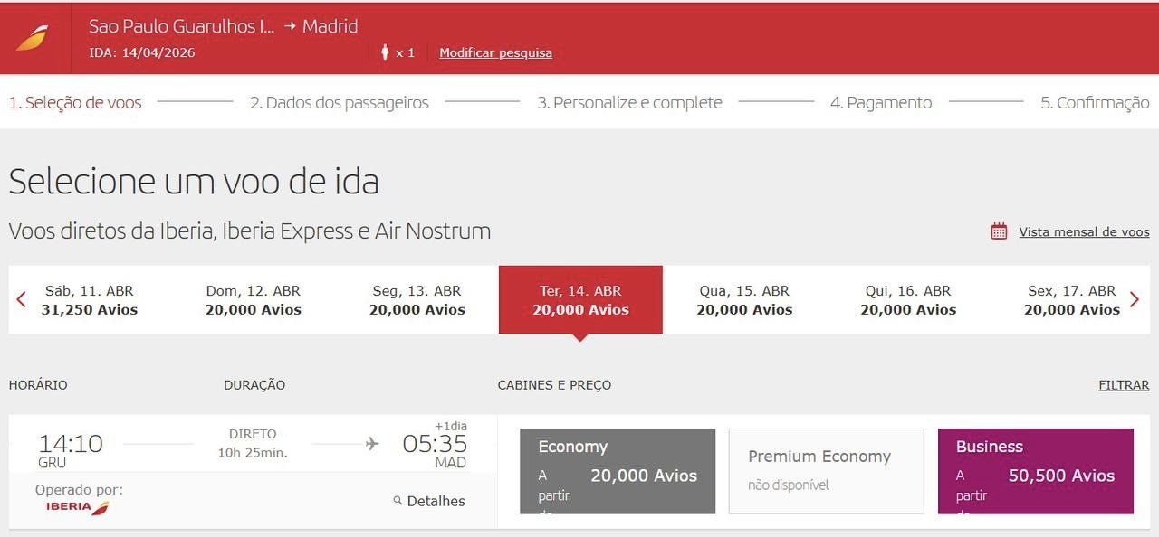 - Custo no Iberia Club (tarifa basic): 20,000 Avios + US$ 80,30 (taxa)