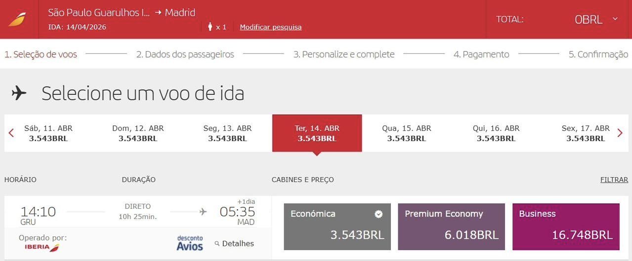A mesma passagem em Classe Econômica, que pode ser emitida por 20.000 Avios, também está disponível na tarifa Comercial por R$ 3.543,00, conforme mostrado nos prints acima. Ao comparar as duas opções, vemos que utilizar os Avios do Iberia Club resulta em uma economia de mais de 55% – uma diferença significativa que destaca o poder de usar seus Avios de forma estratégica.