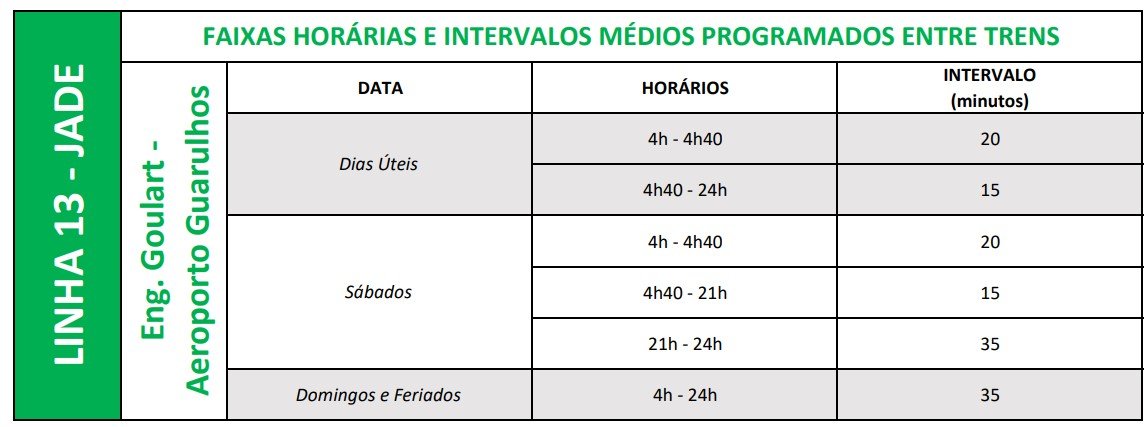 Veja abaixo a tabela completa disponível no site da CPTM: