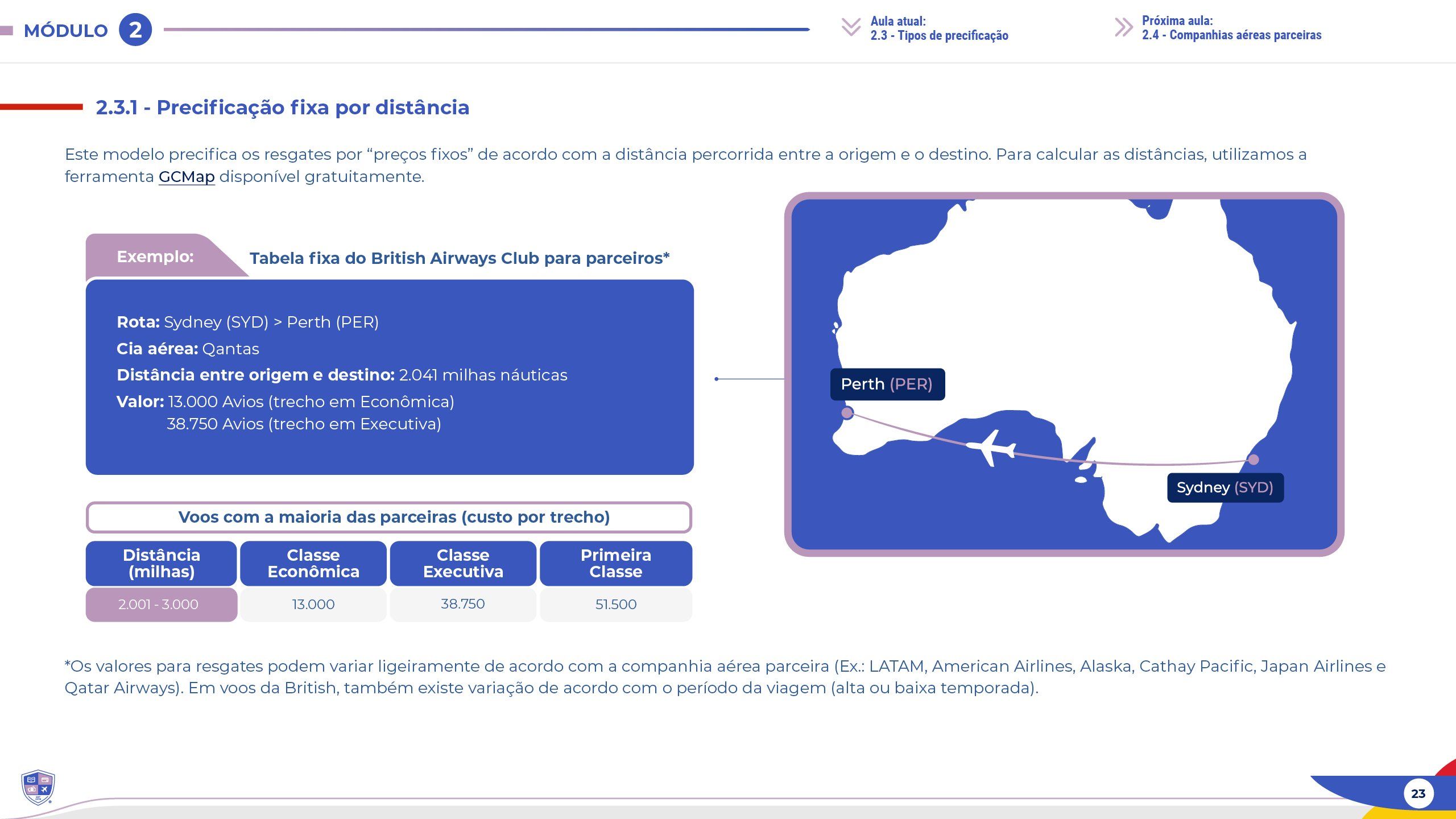 Exemplo prático que está no Material do Mundo Avios: na rota de Sydney para Perth pela Qantas, parceira do British Airways Club, a distância entre as duas cidades é de 2.041 milhas náuticas e o custo da emissão pode variar – 13.000 Avios em Econômica e 38.750 Avios em Executiva.