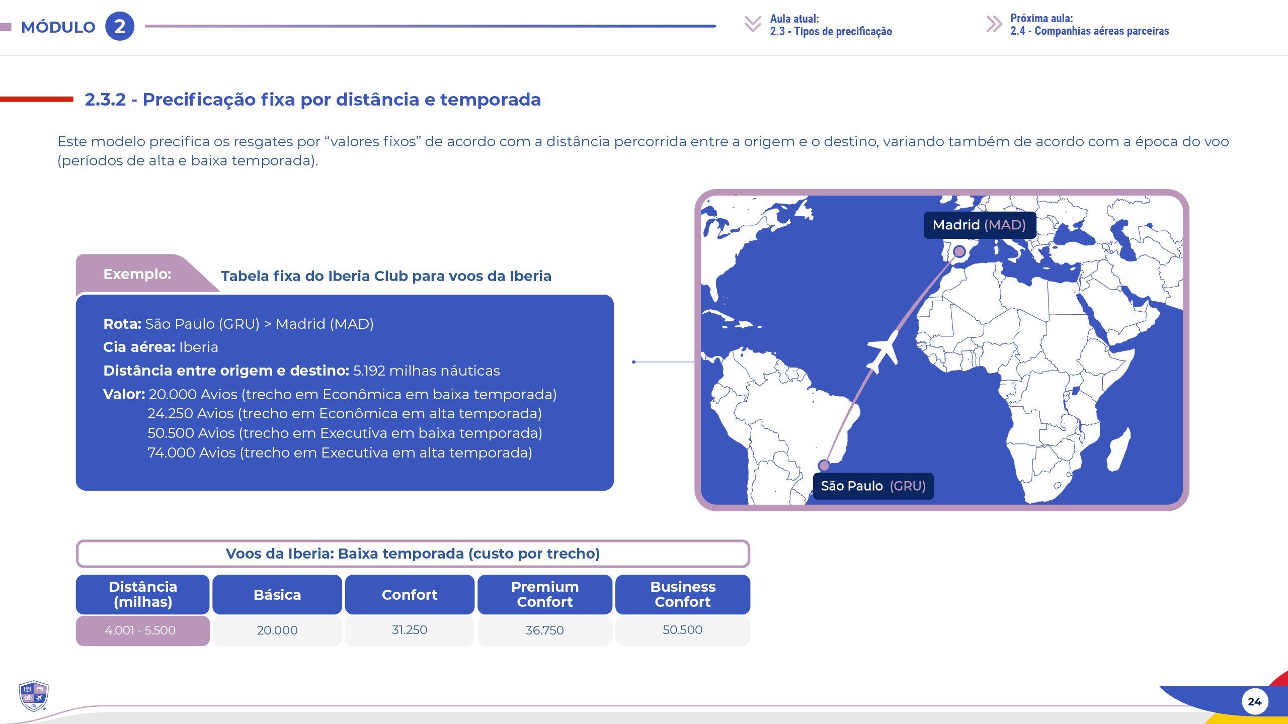 Exemplo prático que está no Material do Mundo Avios: na rota de São Paulo para Madrid pela Iberia, a distância entre as duas cidades é de 5.192 milhas náuticas e o custo da emissão, considerando a tabela fixa do Iberia Club, pode variar – em baixa temporada, um trecho em Econômica pode custar 20.000 Avios, enquanto em alta temporada, o mesmo trecho pode ir para 24.250 Avios. Para a Classe Executiva, os valores podem ser de 50.500 Avios em baixa temporada e 74.000 Avios em alta temporada. Essa variação sazonal é uma vantagem para quem pode viajar na baixa temporada, garantindo resgates mais baratos e mais economia na viagem.