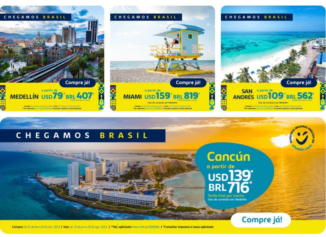 A partir de Medellin, a Viva Air oferece conexões para outras cidades colombianas, como é o caso do arquipélago caribenho de San Andrés – um dos destinos preferidos dos brasileiros. A empresa também oferece conexões para alguns destinos internacionais, como é o caso de Miami e Cancun. Através do site da empresa é possível ver os banners de anúncio da estreia da companhia no Brasil: