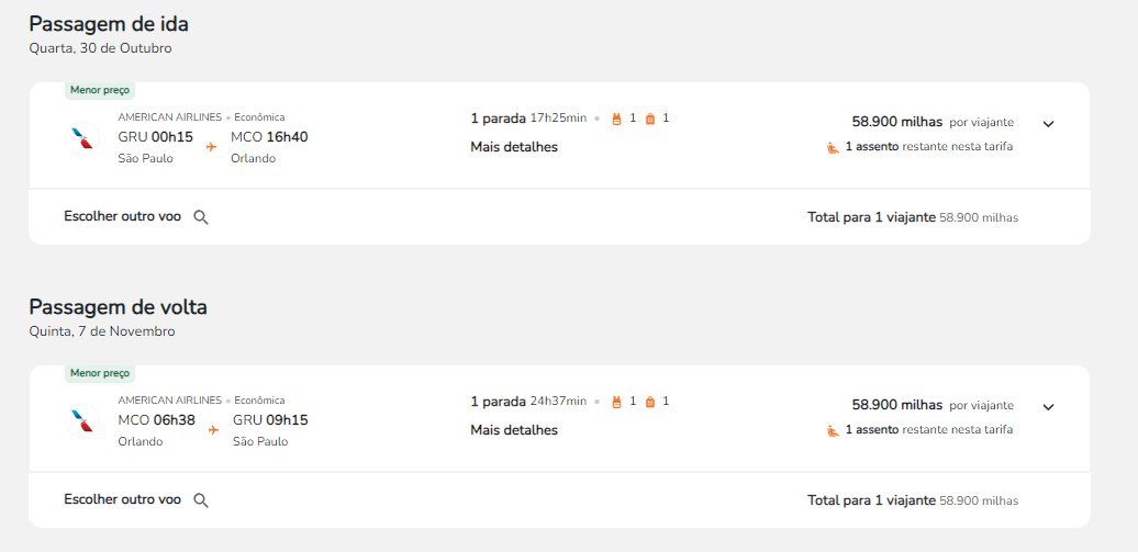 Com a pontuação adquirida, após assinar o Clube Smiles e garantir a maior pontuação com a aquisição do Samsung Galaxy S24, você tem várias possibilidades de resgates de passagens. Para exemplificar, realizamos a simulação de uma emissão ida e volta para Orlando na qual você pode utilizar a ferramenta Viaje Fácil e garantir a sua reserva.