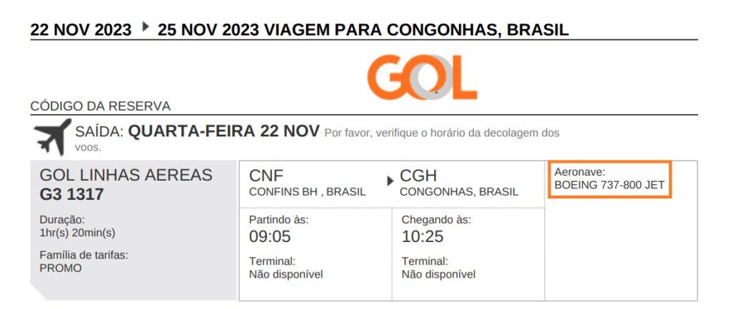 Se você já tem um voo emitido com a companhia, poderá verificar no e-mail de confirmação qual será a aeronave que operará o trecho. Veja abaixo um exemplo em que, até então, está escalado um 737-800: