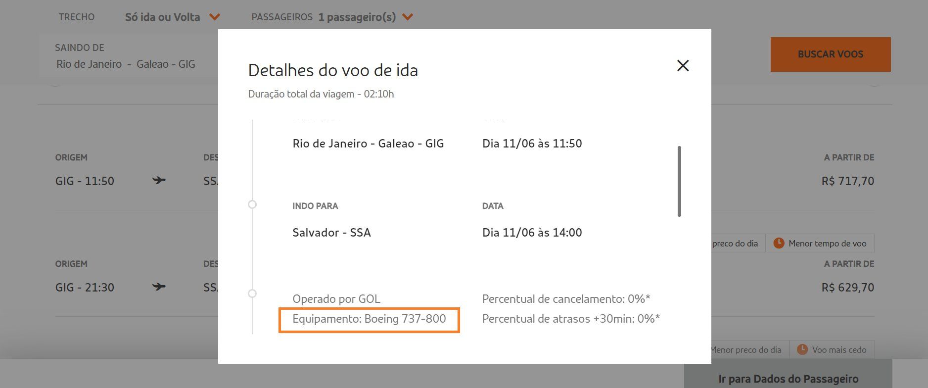 Agora, se você ainda não comprou a sua passagem, é possível verificar qual será a aeronave escalada diretamente no site da companhia ao clicar nos detalhes do voo. Veja um exemplo abaixo: