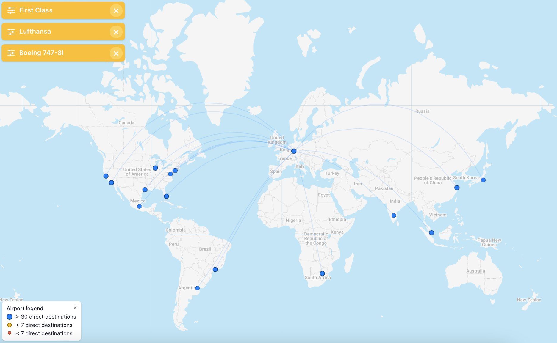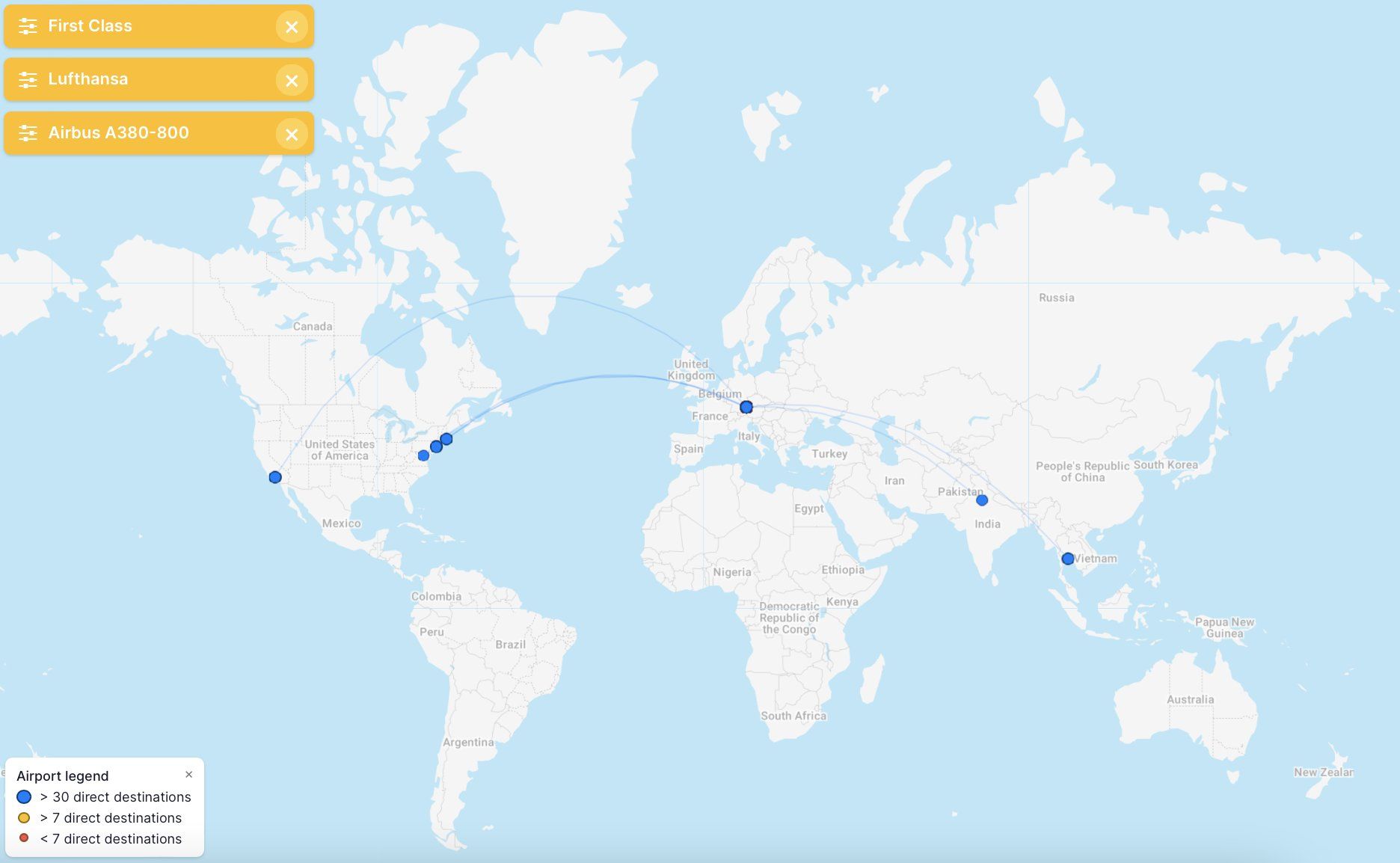 Atualmente, a Primeira Classe da Lufthansa está presente em três modelos de aeronave: o Airbus A340-600, o Airbus A380-800 e o Boeing 747-8. Enquanto o A340 opera tanto no Aeroporto de Frankfurt quanto no de Munique, o mesmo não acontece com as outras duas aeronaves. O A380 está presente apenas em voos com origem ou destino em Munique; já o B747, ele é operado somente em Frankfurt.