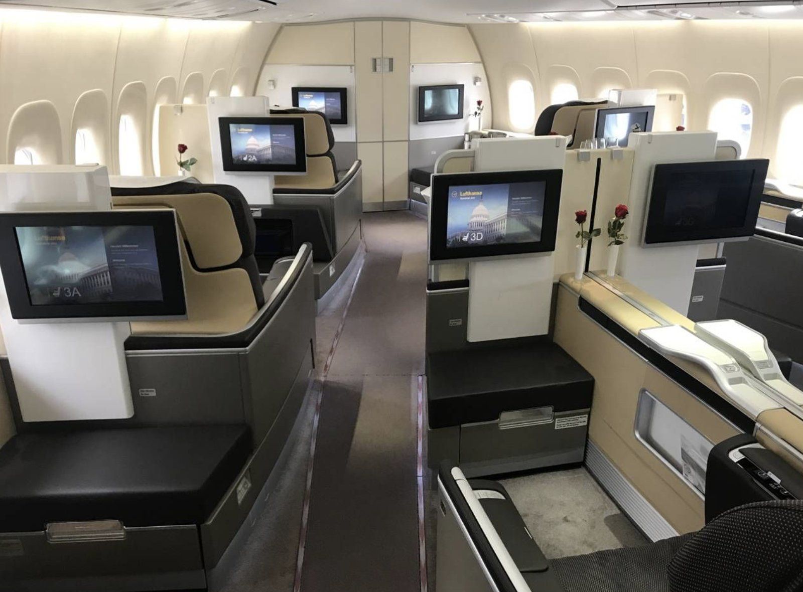 Em ambos os modelos, a Lufthansa possui oito assentos em sua Primeira Classe. No entanto, a configuração presente nos Boeings 747-8 apresentam diferenças em relação às aeronaves da Airbus.