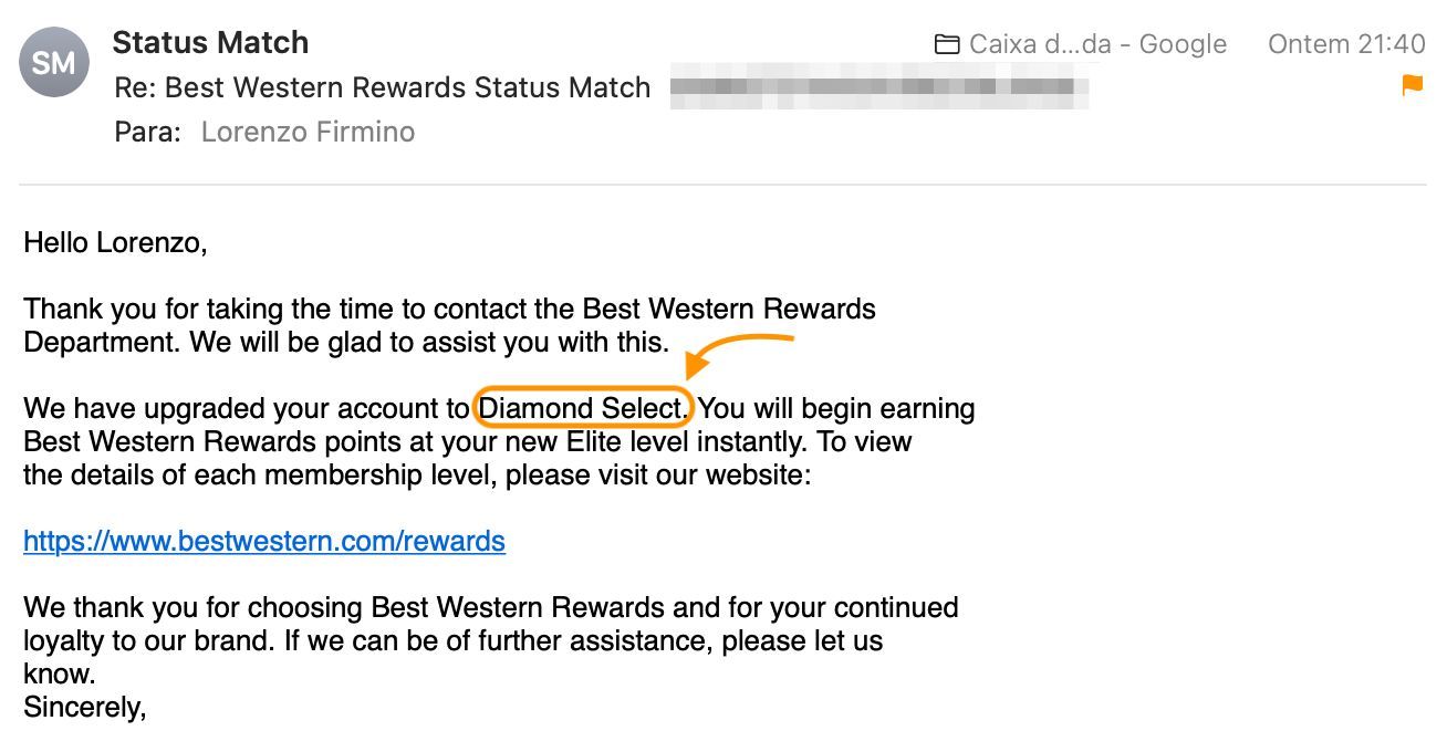 No fim do dia de ontem eu resolvi testar esse Status Match do Best Western Rewards. Preenchi o formulário acima e em torno de 3h depois do envio formulário minha solicitação foi deferida. Me tornei “Diamond Select” no BWR.