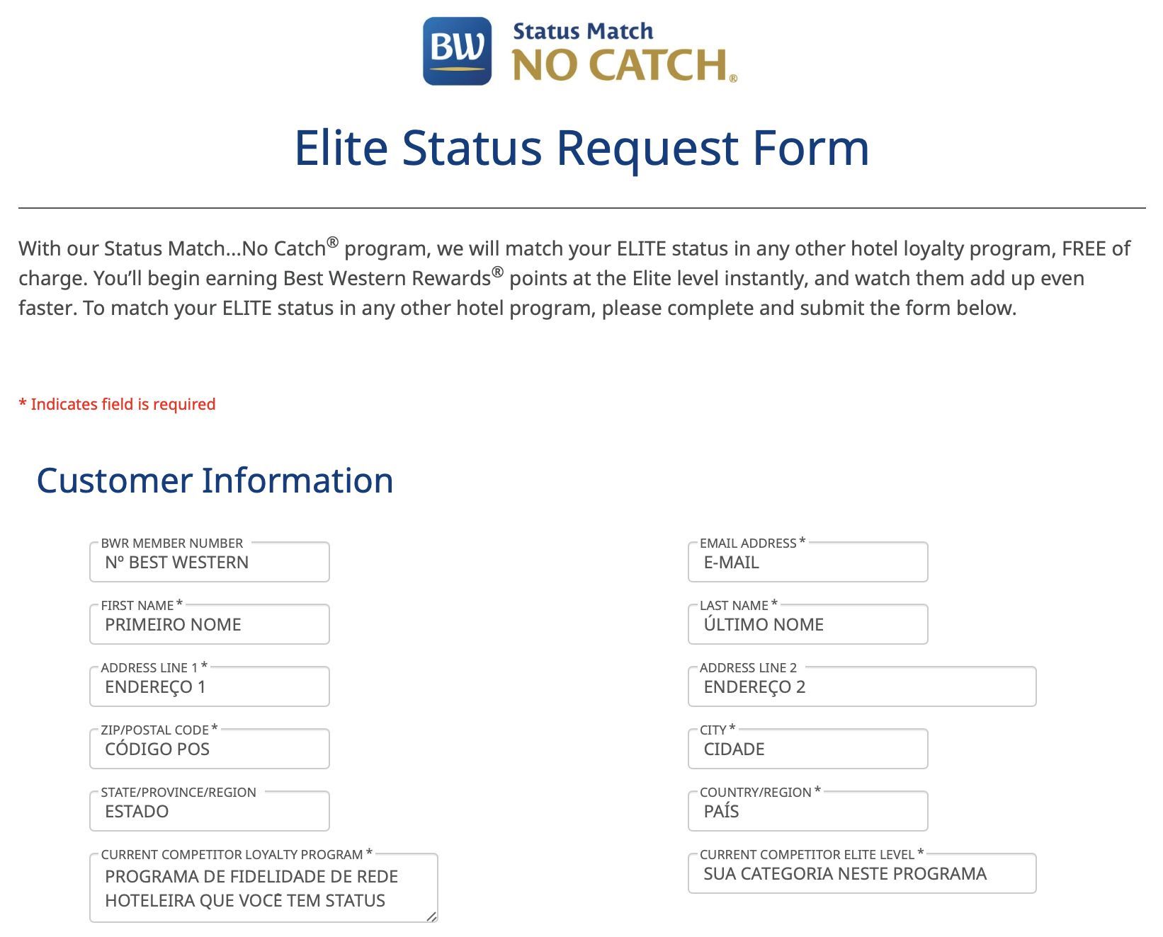 Para solicitar o Status Match do Best Western Rewards basta você preencher o formulário desse link conforme os campos na imagem abaixo: