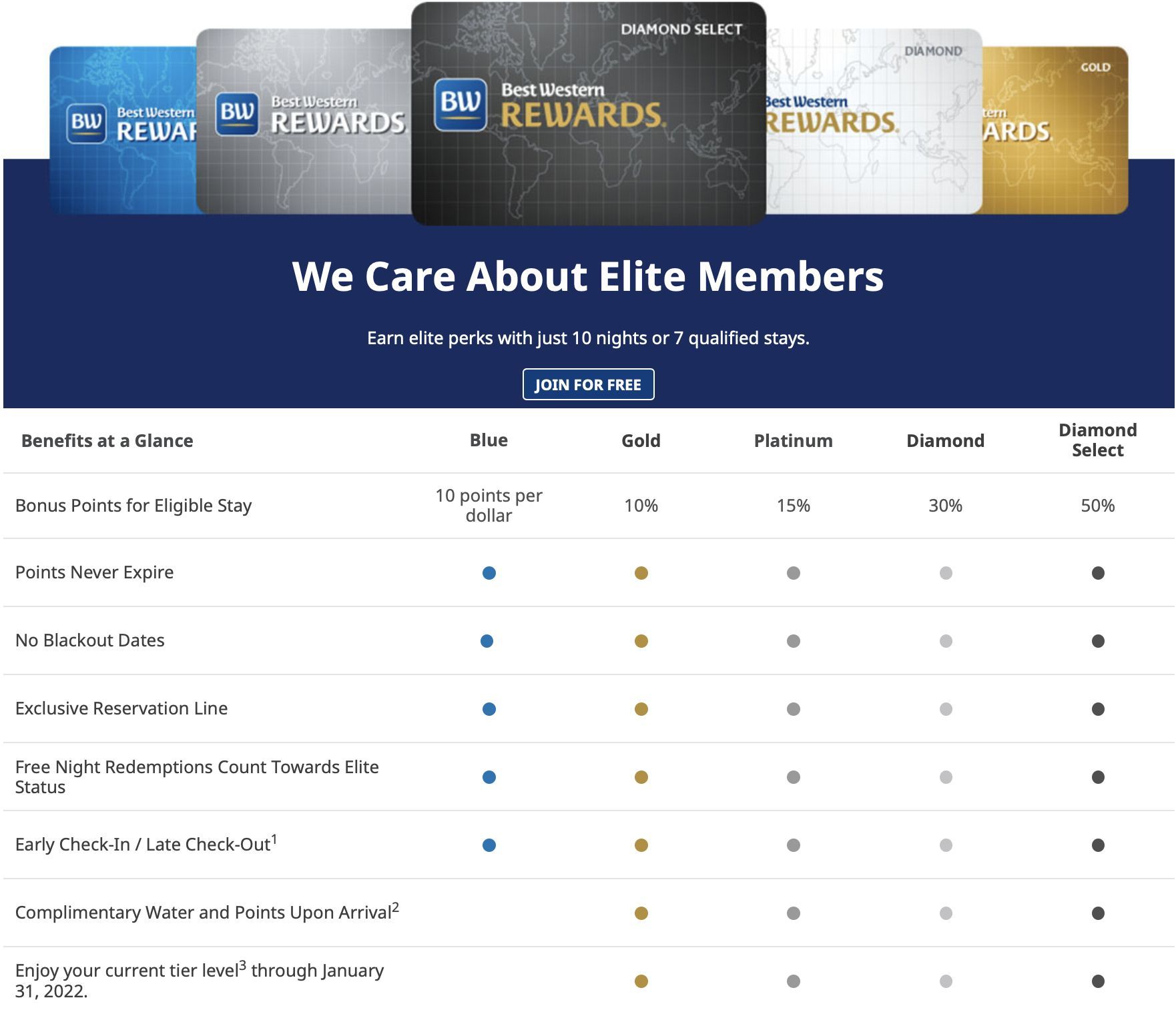 Os benefícios do Best Western Rewards são fracos (o que pode explicar porque conseguir um status no programa seja tão fácil). Penso que o maior benefício para membros top tiers do BWR [categoria Diamond Select] é a possibilidade de receber 50% de pontos bônus em estadias elegíveis. Estes pontos nunca expiram.