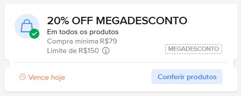 - 20% off, chegando até R$ 150 de desconto, em compras a partir de R$ 79, com o cupom ‘MEGADESCONTO‘ [sem aspas];