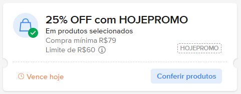 - 25% off, chegando até R$ 60 de desconto, em compras a partir de R$ 79, com o cupom ‘HOJEPROMO‘ [sem aspas];