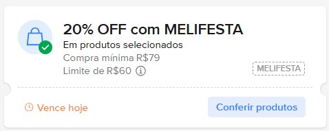- 20% off, chegando até R$ 60 de desconto, em compras a partir de R$ 79, com o cupom ‘MELIFESTA‘ [sem aspas].