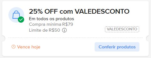 - 25% off, chegando até R$ 50 de desconto, em compras a partir de R$ 79, com o cupom ‘VALEDESCONTO‘ [sem aspas];