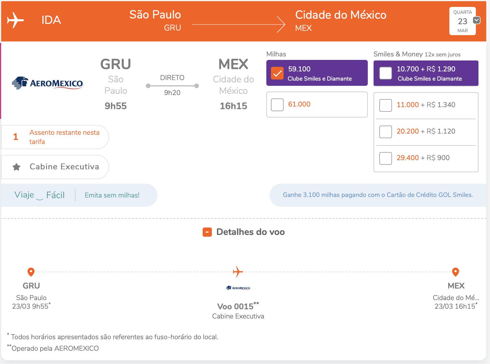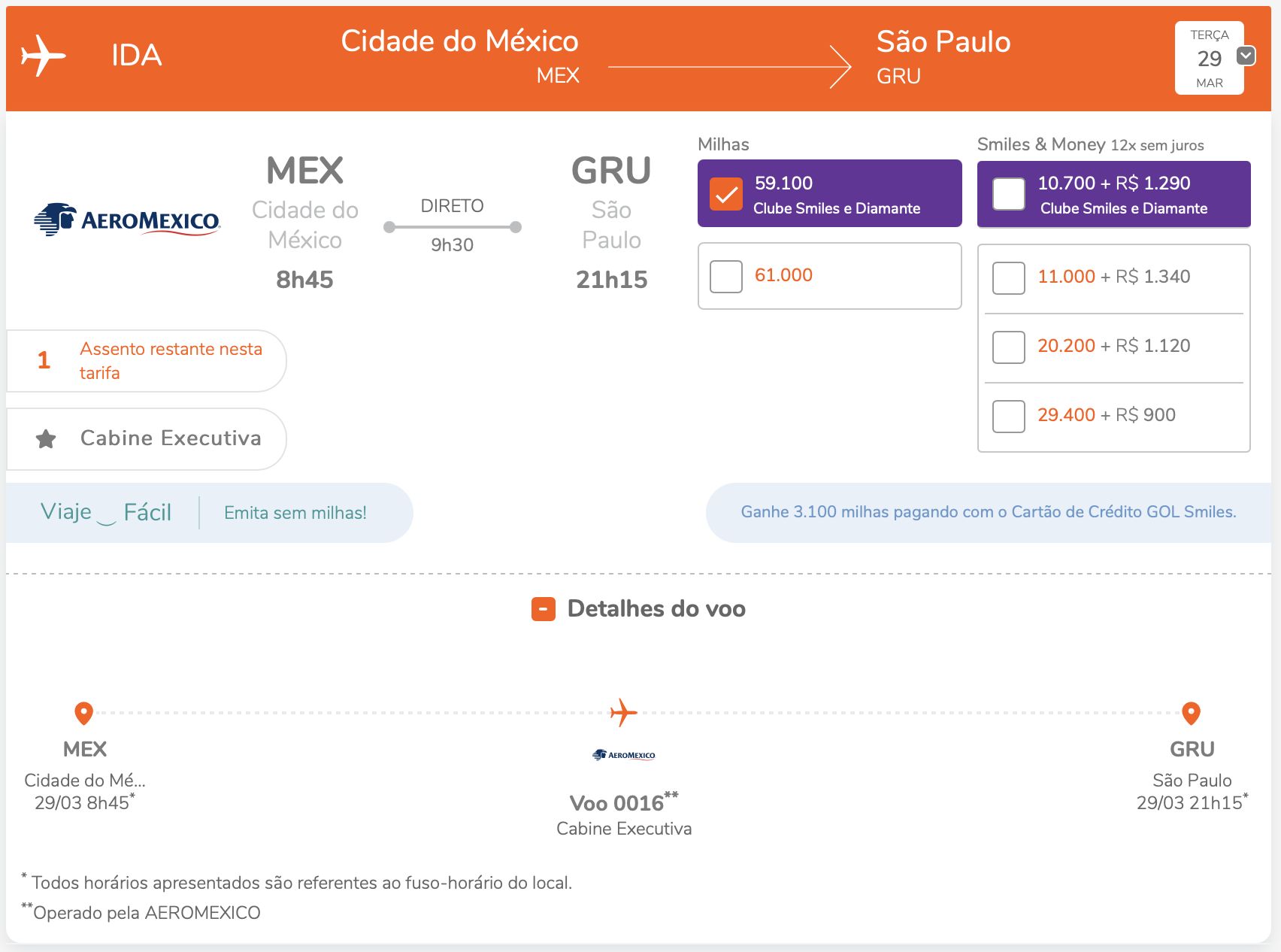 Ainda que a Smiles tenha uma precificação dinâmica [que pode oscilar para mais ou para menos] usualmente os preços não variam tanto no curto-prazo. Neste momento, o programa está tarifando os voos diretos São Paulo (GRU) x Cidade do México (MEX) por 59.100 milhas em Classe Executiva.