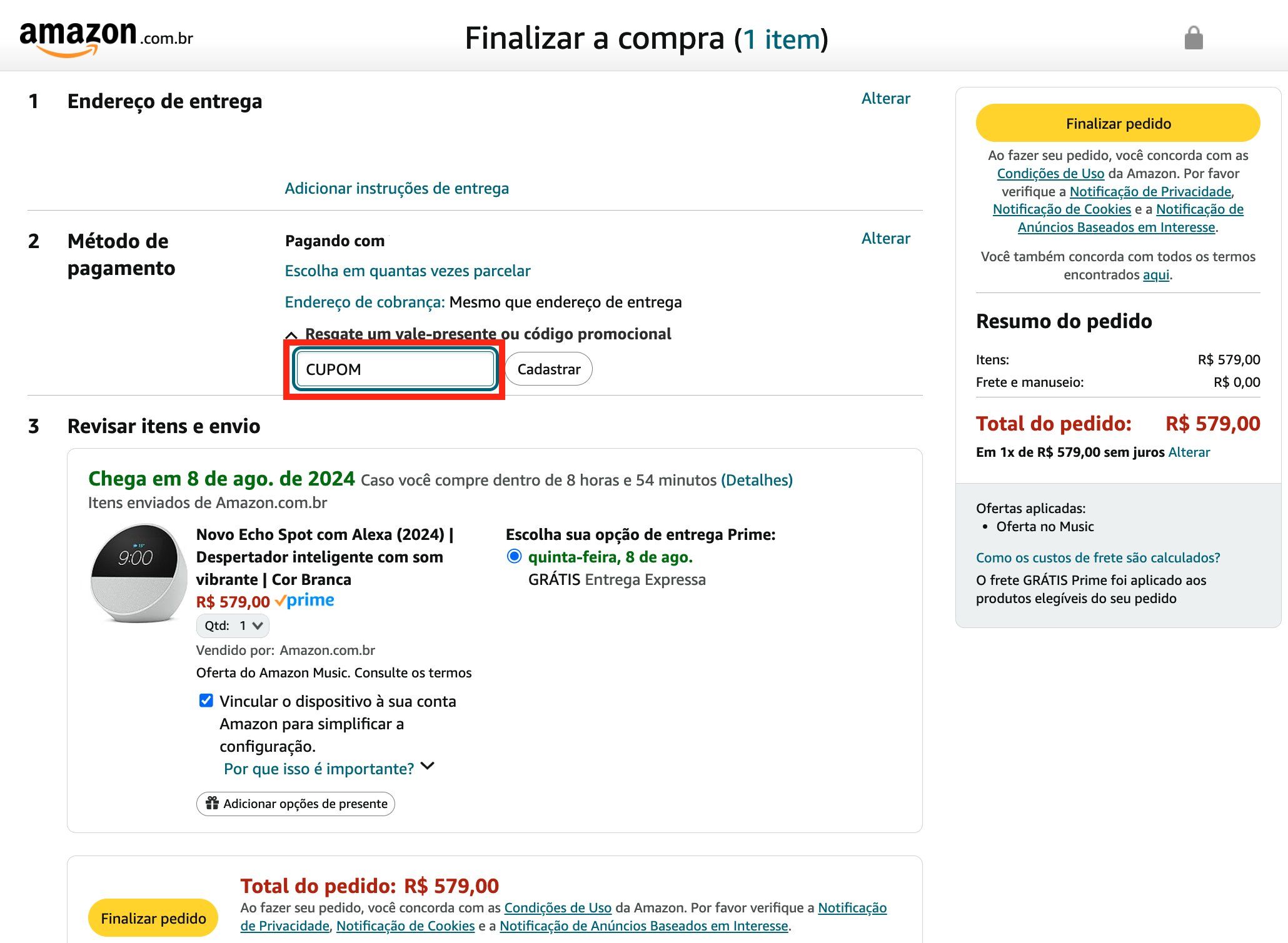 Para obter o desconto, basta inseri-lo no momento de finalizar as compras, no campo “Código promocional” (indicado em vermelho abaixo), e clicar em “Cadastrar”. O cupom de desconto é aplicado na hora e o desconto é exibido na tela imediatamente, junto do novo preço da compra.