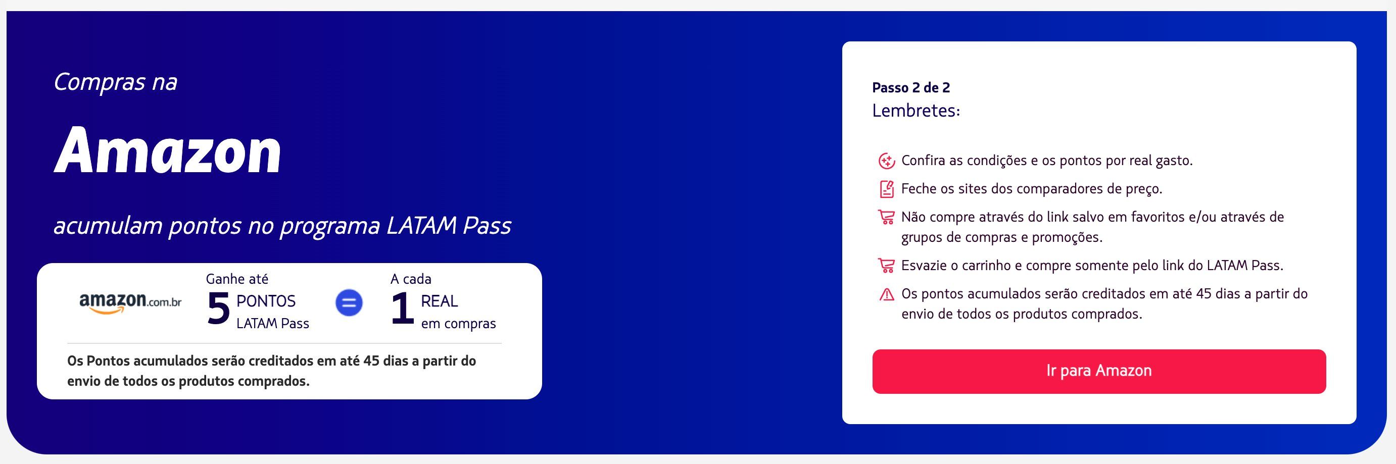 Quando você realiza sua compra na Amazon através do LATAM Pass, você pode obter ótimas bonificações em forma de pontos no programa de fidelidade da LATAM. Esses pontos podem ser utilizados dentro da plataforma do programa em forma de resgates de passagens aéreas, produtos, vouchers, pacotes de viagem, vales-combustível e muito mais.