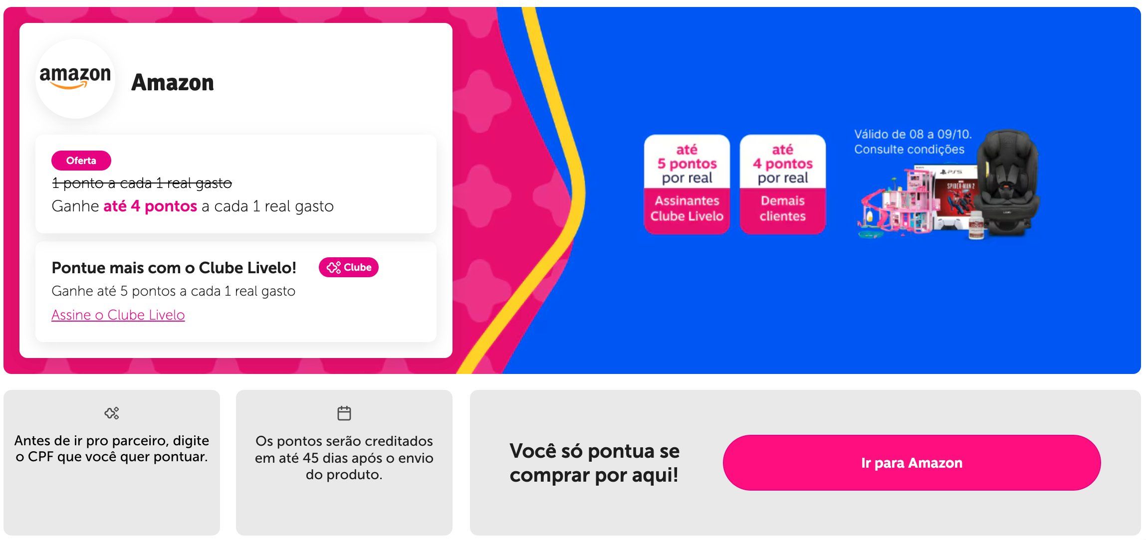 Após criar sua conta, você já está elegível ao sistema “Compre e pontue”, onde você realiza suas compras na Amazon através da Livelo e recebe pontos por isso. A proporção usual das compras é de 0,5 ponto a cada real gasto. Mas, frequentemente, você consegue obter bonificações maiores, como a que acontece até amanhã (9), oferecendo até 5 pontos Livelo a cada real gasto na Amazon.