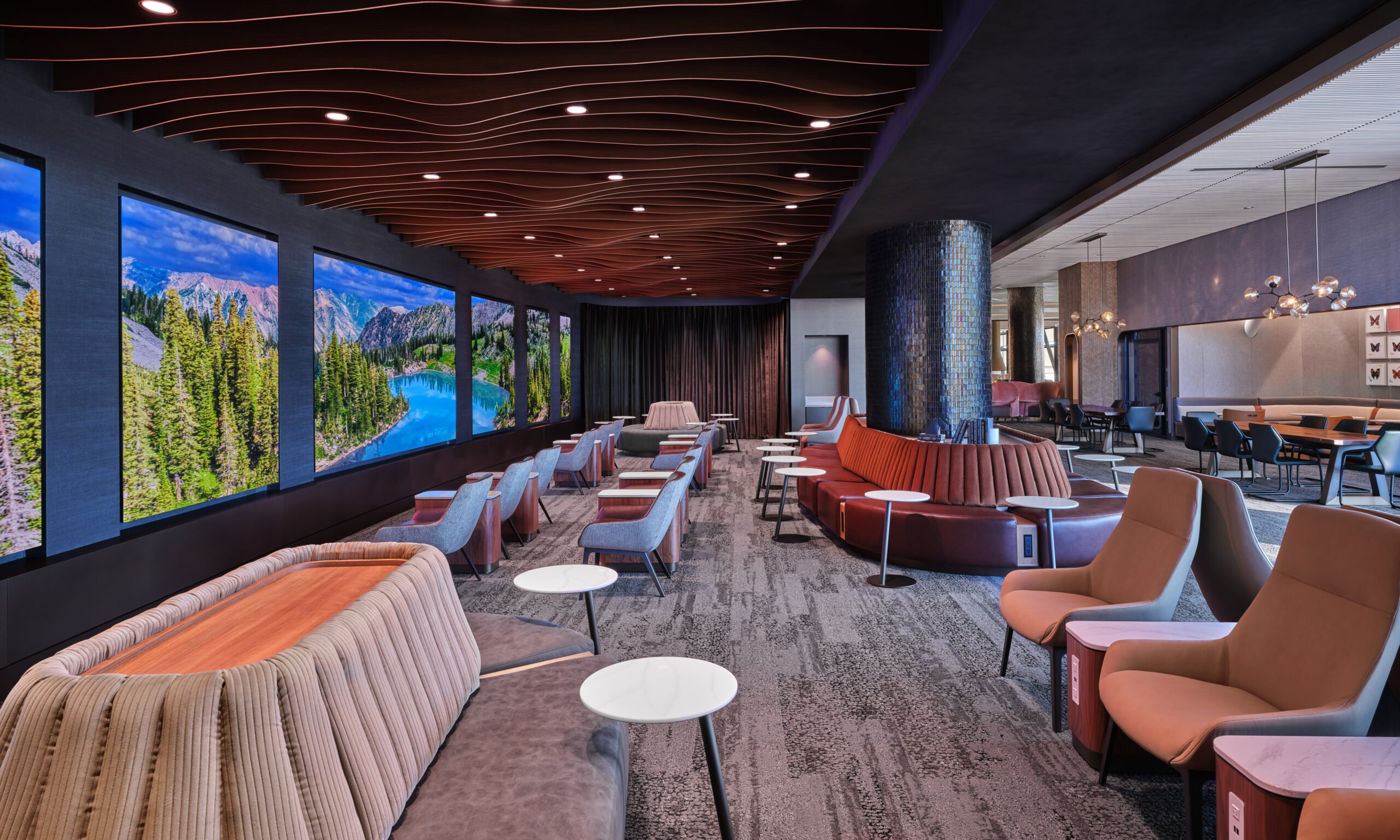As obras de arte locais completam a experiência sensorial, apresentando artistas de Utah e peças que destacam as cores e texturas regionais. Um dos destaques é a parede de imersão digital — a primeira do tipo em um Sky Club — que envolve os visitantes com imagens panorâmicas de marcos icônicos do estado e sons da natureza, criando uma atmosfera de relaxamento.
