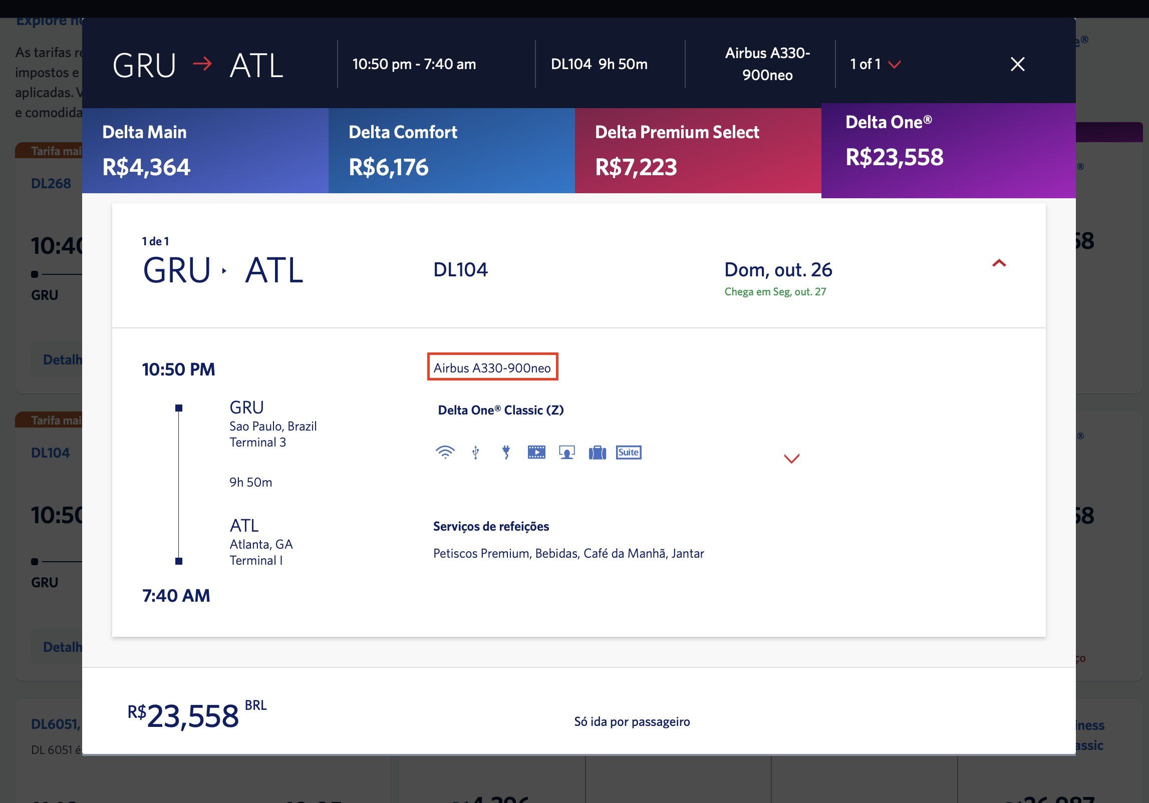 Além dos voos para Nova York, a companhia irá substituir o A330-300 pelo A330-900 em um dos voos diários entre Atlanta (ATL) e São Paulo (GRU). Em nossas pesquisas, dos dois voos diários que a Delta opera para Atlanta, a operação noturna será contemplada com a nova cabine. A mudança ocorre a partir do dia 26 de outubro. Confira: