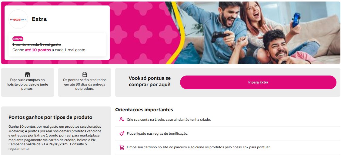É válido ressaltar que, no caso desse exemplo do Extra, não há necessidade de aplicar cupons antes do pagamento para que a compra pontue na Livelo. Além disso, em algumas promoções, os assinantes do Clube Livelo recebem mais pontos por real (ou dólar) gasto do que os demais clientes. Contudo, atente-se que as regras mudam de parceiro para parceiro e que as instruções são encontradas na hora de acessar o site da parceria, através da Livelo.