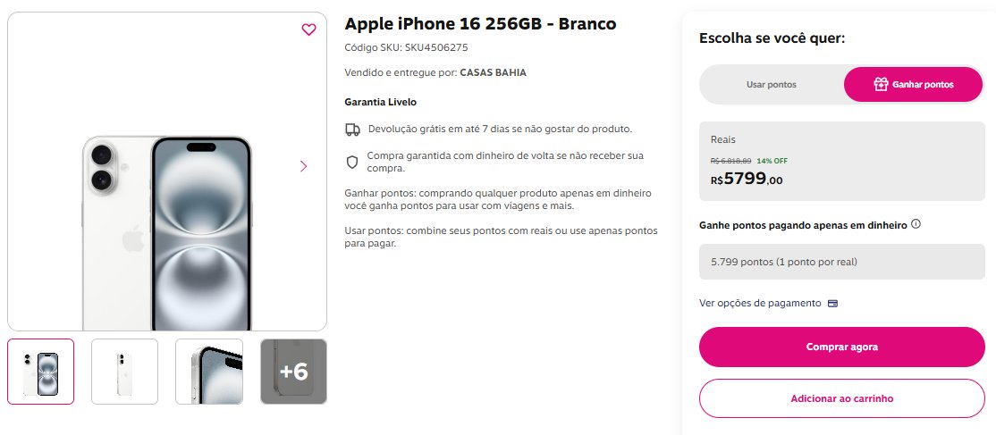 Veja abaixo um exemplo de compra de um iPhone 16 de 258GB: