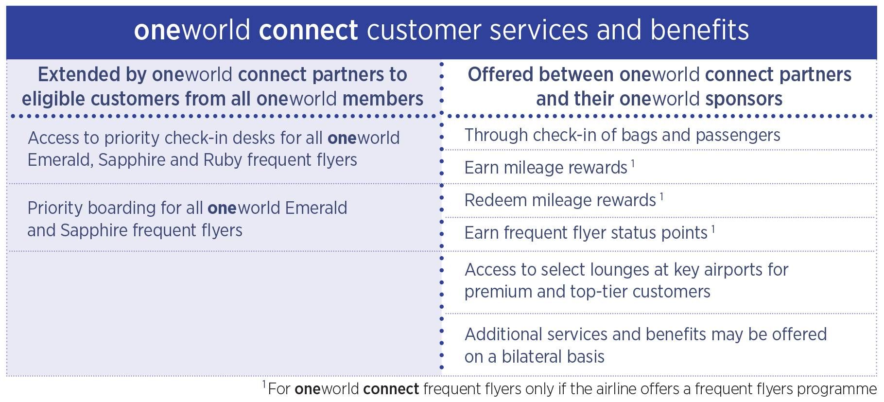 Os parceiros Oneworld Connect vão receber alguns benefícios da aliança específicos para passageiros frequentes de qualquer companhia que faça parte da Oneworld, com outros adicionais para aqueles que tiverem status nos programas dos seus patrocinadores.