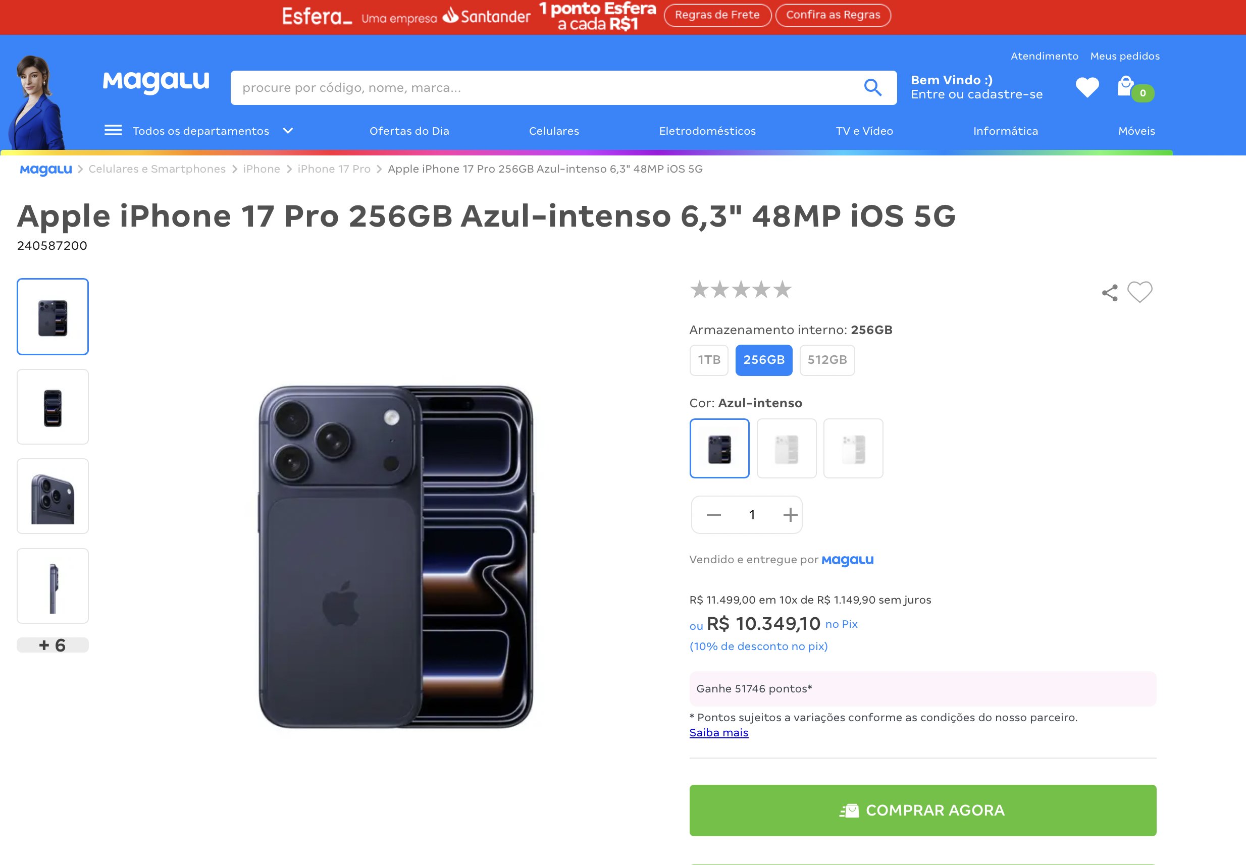 Ao selecionar um item na Magalu, confira que é informada a quantidade de pontos que será acumulada com a compra. Veja abaixo o exemplo de compra de um iPhone 17 Pro, onde são ofertados 5 pontos por real gasto (os pontos adicionais válidos para assinantes do Clube Esfera serão creditados após a compra).