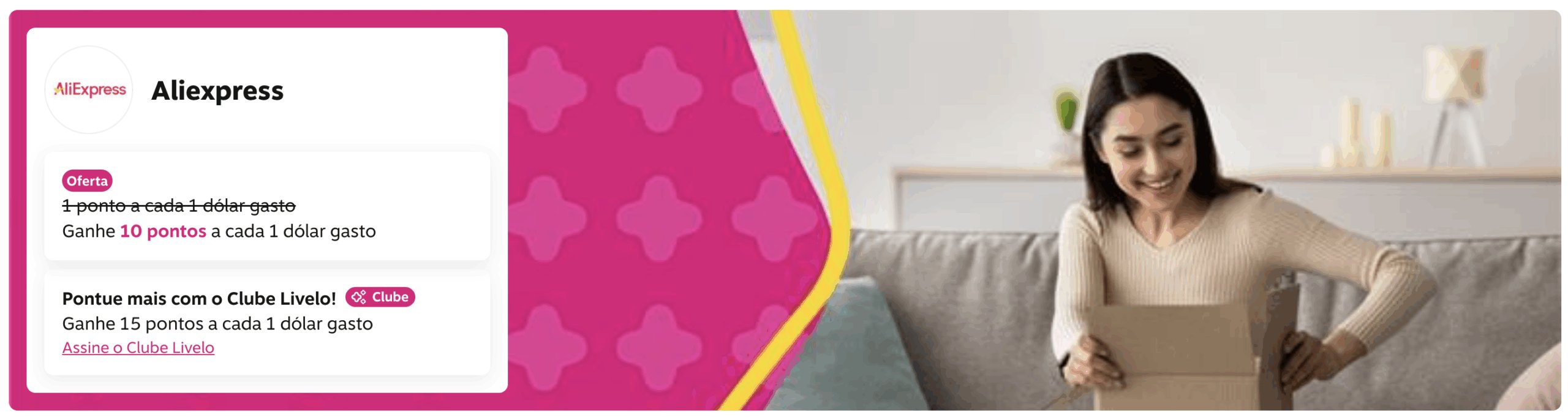 Para quem quer presentear as crianças com um brinquedo, uma sugestão é aproveitar a campanha com a AliExpress, válida até terça-feira (07) e que garante 15 pontos por dólar gasto para quem é assinante do Clube Livelo, e 10 pontos por dólar gasto para demais clientes. Para pontuar, é preciso acessar a página da parceria com a AliExpress, como você pode ver abaixo: