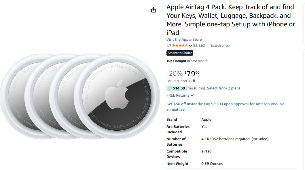 Veja abaixo o exemplo de compra do Apple AirTag vendido pelo site da Amazon dos EUA: