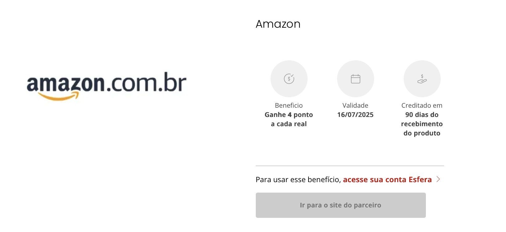 A Esfera está oferecendo 4 pontos por real gasto em todas as categorias durante o Prime Day da Amazon. A promoção é válida até quarta-feira (16). Saiba como aproveitar.