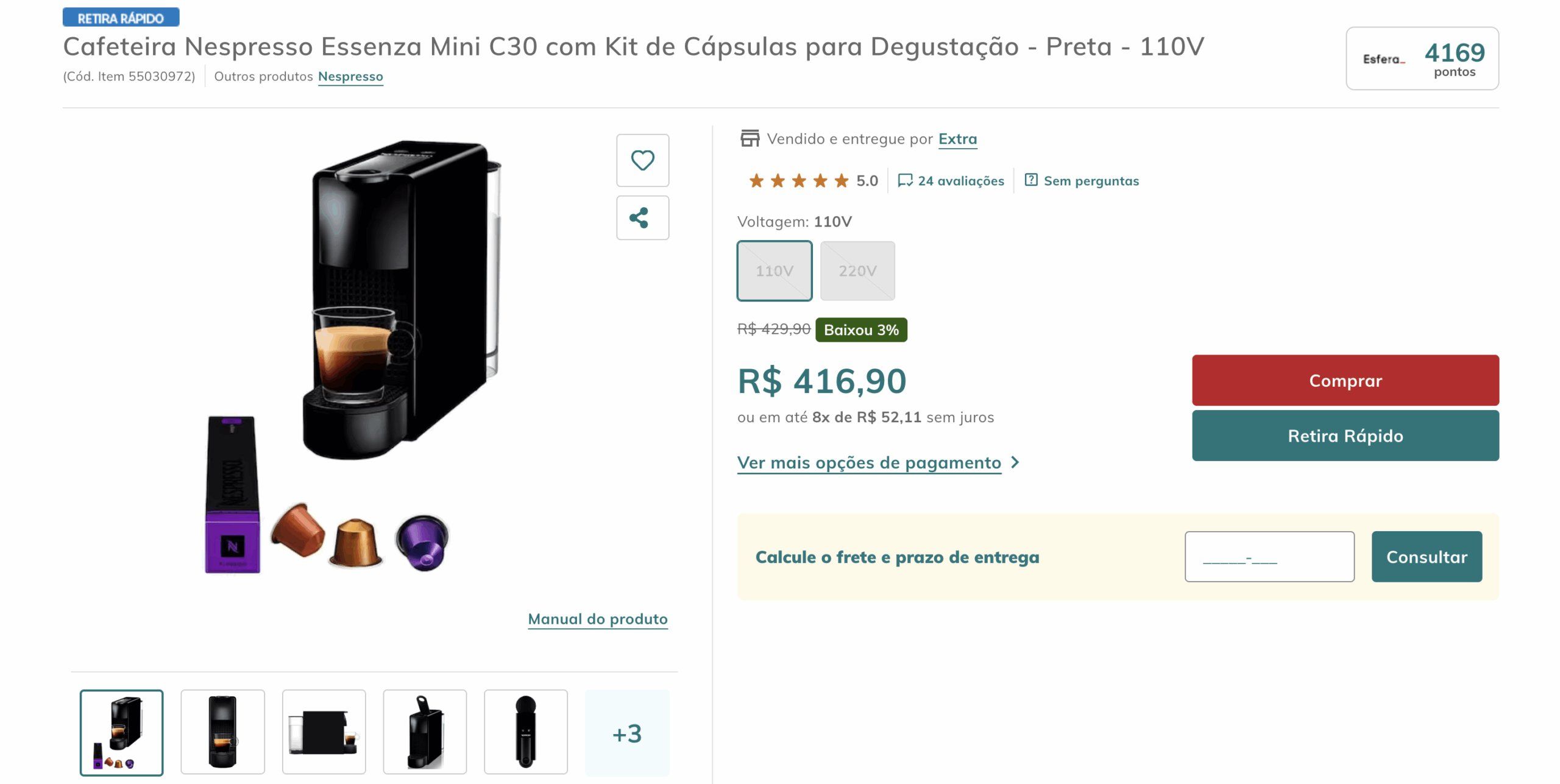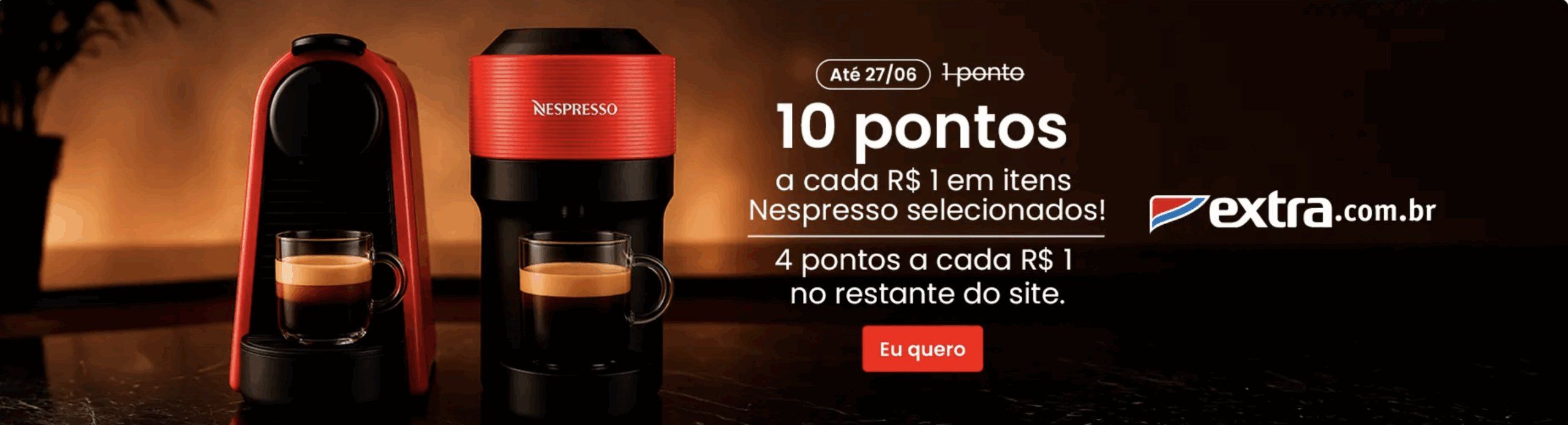 A Esfera está oferecendo até 10 pontos por real gasto em itens selecionados da Nespresso vendidos e entregues pelo Extra. Outras categorias no site também oferecem boas pontuações. A promoção é válida até sexta-feira (27).