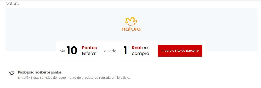 A Esfera está oferecendo até 12 pontos por real gasto na Natura e até 7 pontos por real gasto no Pontofrio. As ofertas contemplam todas as opções de pagamento disponíveis no ato da compra e têm períodos de validade distintos. Confira!
