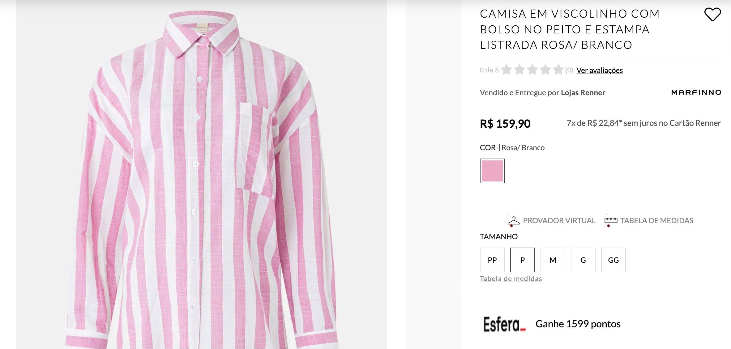 Ao selecionar um produto, é possível ver, no canto inferior direito do site, a quantidade exata de pontos que será recebida. Lembre-se, contudo, de que só participam do acúmulo bonificado os itens vendidos e entregues pela Renner, como é o caso do exemplo abaixo: