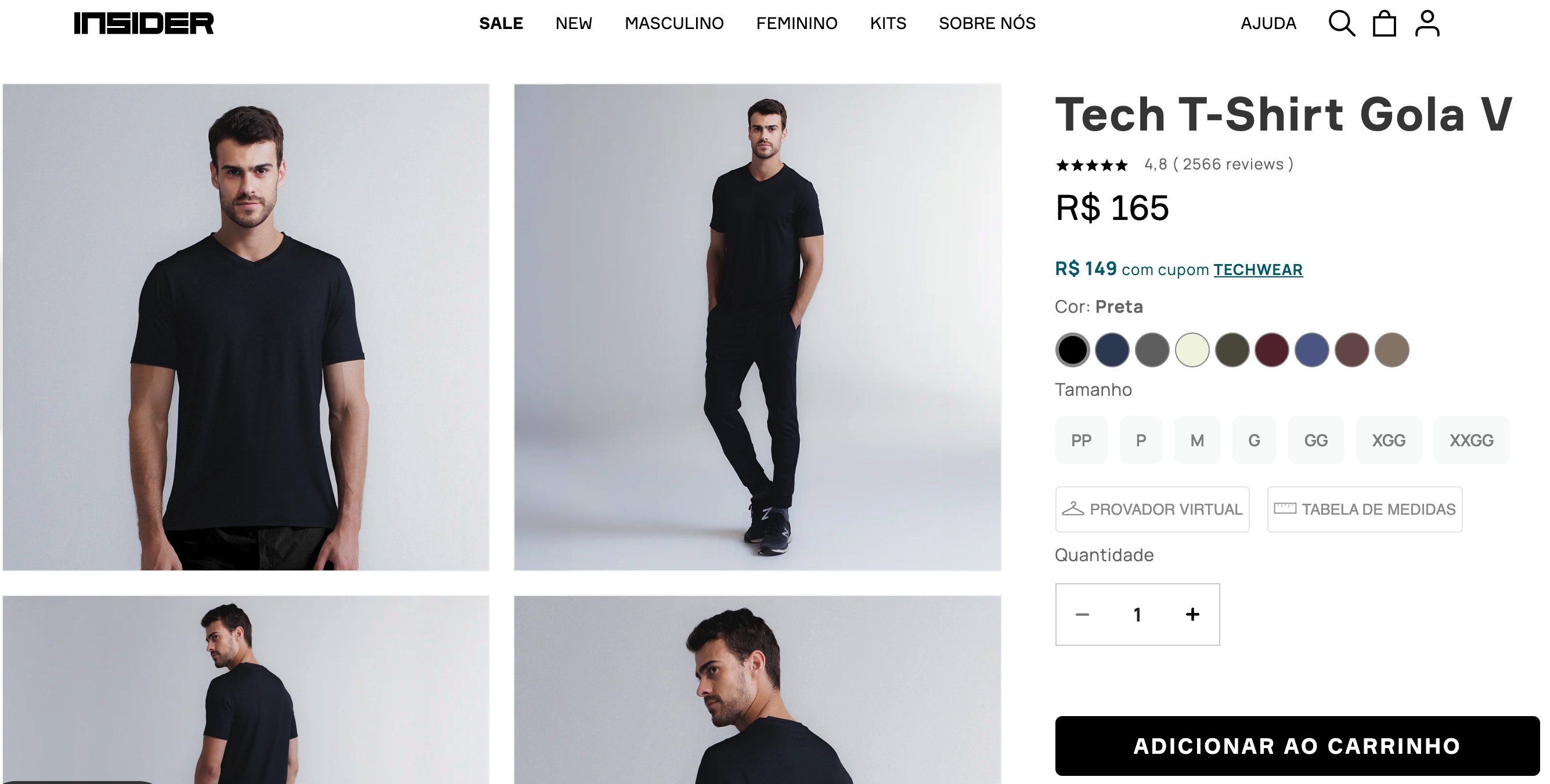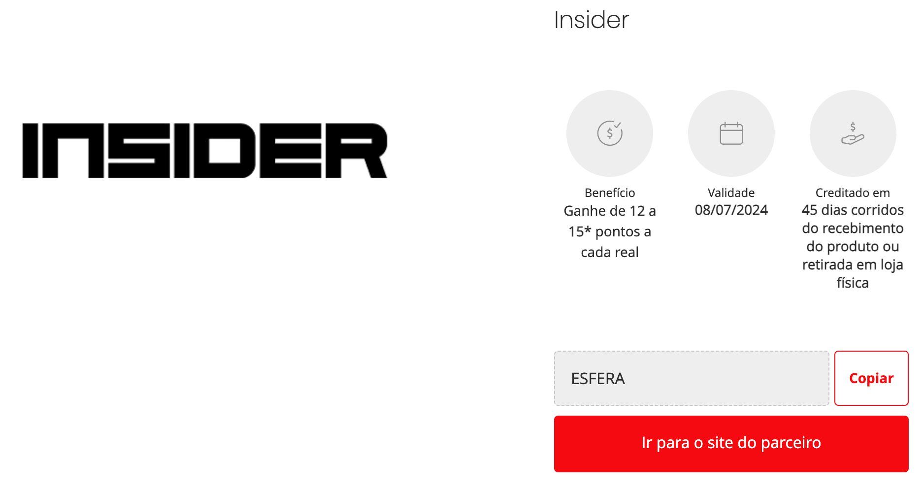 Ao selecionar um produto, a quantidade de pontos que será recebida não é exibida em tela. Não se esqueça que para pontuar em compras na Insider, é necessário adicionar o cupom “ESFERA” [SEM ASPAS] antes de finalizar a compra.