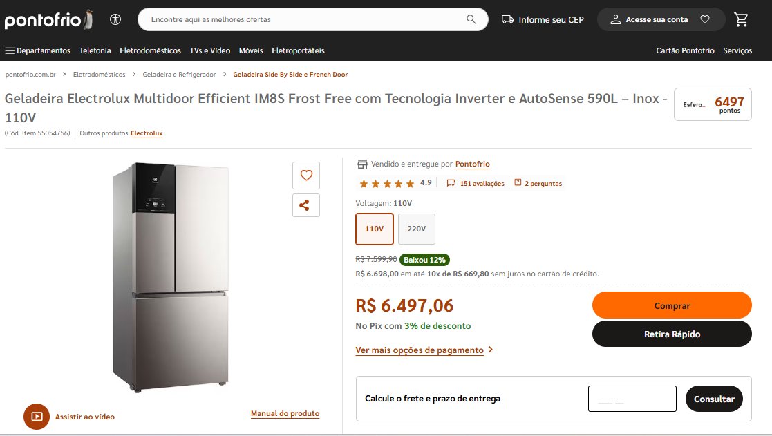 Note que, ao realizar uma compra no Ponto Frio, o número de pontos acumulados é exibido no canto superior direito da tela. No entanto, ele não reflete o oferecido pela campanha. Confira: