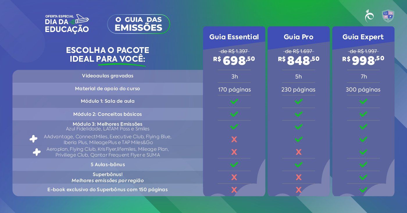 A promoção é válida para os três Guias — Essential, Pro e Expert —, mas aqui vai uma recomendação: o Guia Expert oferece o melhor custo-benefício e atende a todos os perfis de viajantes. Com 18 programas de fidelidade (incluindo KrisFlyer, lifemiles, Privilege Club e mais cinco programas internacionais exclusivos), é o mais completo dos nossos guias. Ideal para quem deseja explorar o mundo sem limites e se aprofundar em estratégias avançadas de emissão.