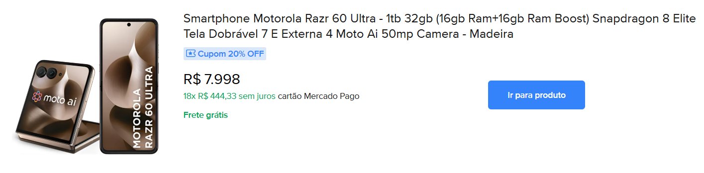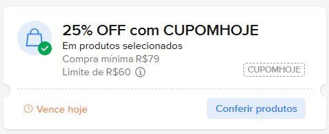 - 25% off, chegando até R$ 60 de desconto, em compras a partir de R$ 79, com o cupom ‘CUPOMHOJE’ [sem aspas]. Válido para todos os produtos do Mercado Livre;
