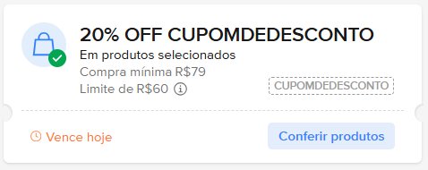 - 20% off, chegando até R$ 80 de desconto, em compras a partir de R$ 79, com o cupom ‘CUPOMDEDESCONTO’ [sem aspas]. Válido para todos os produtos do Mercado Livre;