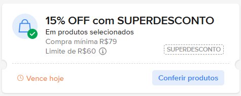 - 15% off, chegando até R$ 60 de desconto, em compras a partir de R$ 79, com o cupom ‘SUPERDESCONTO’ [sem aspas]. Válido para todos os produtos do Mercado Livre;