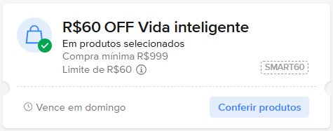 - R$ 60 off, em compras a partir de R$ 999, com o cupom ‘SMART60’ [sem aspas]. Válido em produtos selecionados.