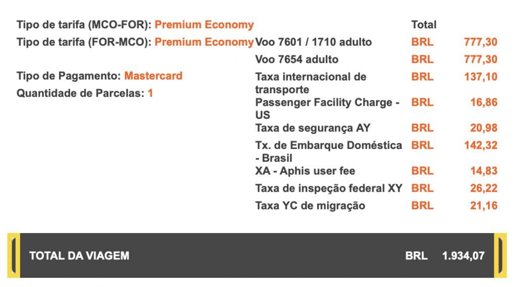O valor total ficou em R$1.934,07 para voar na Premium Economy nos trechos internacionais.